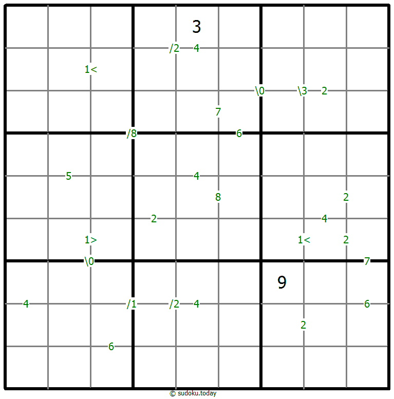• 两个单元格之间的数字表示这些单元格中数字的差异。四个单元格之间的数字表示两个对角相邻单元格之间的差异,左上+右下(\)或右上+左下(/)。如果指定了一个字符<或>,则角度的顶点指向这些数字中较小的一个。