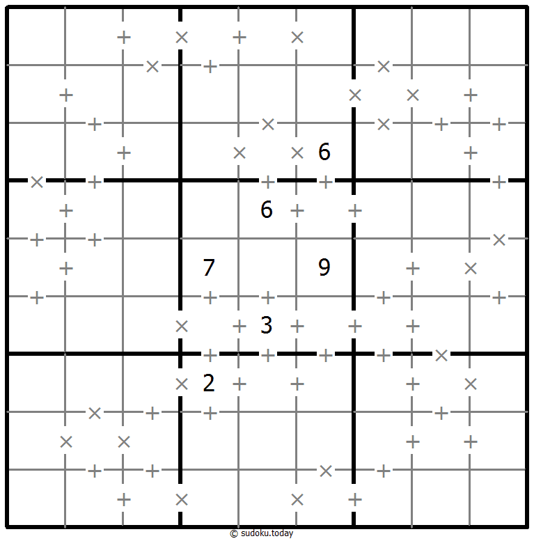 • 两个单元格之间的交叉表示这些单元格中数字的乘积小于10。两个单元格之间的加号表示这些单元格中的数字之和小于10。如果和与积小于10,则这些单元格之间存在交叉。如果两个单元格之间没有符号,则和和和的乘积都至少为10。