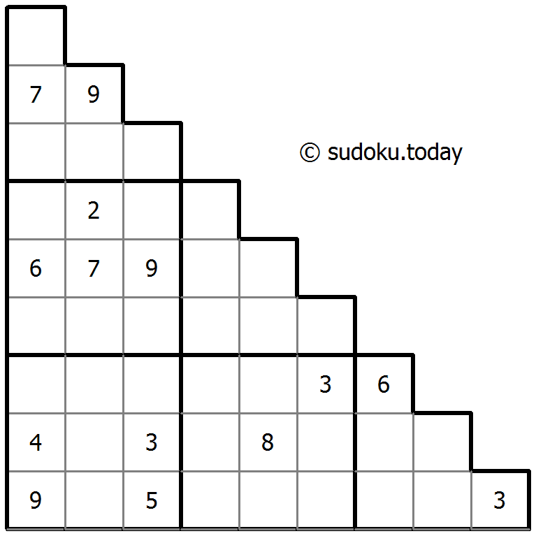 • Sujiken(来自日语sujikai,字面意思是“对角线”)是数独的变体。这个拼图由一个三角形网格组成,其中包含从1到9的数字。目标是用数字填充网格,这样每个单元格都包含一个数字,并且在任何列、行和任何方向的对角线中都不会重复数字。另外,三个较大的3×3正方形区域和由厚边界包围的三个较大三角形区域中的任何一个区域都不会出现两次数字。