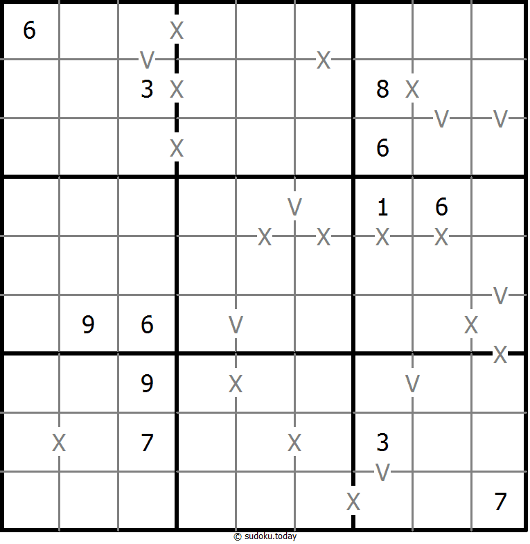 • 数字和为5的相邻单元格用V标记,和为10的相邻单元格用X标记。所有可能的V和X都被标记。